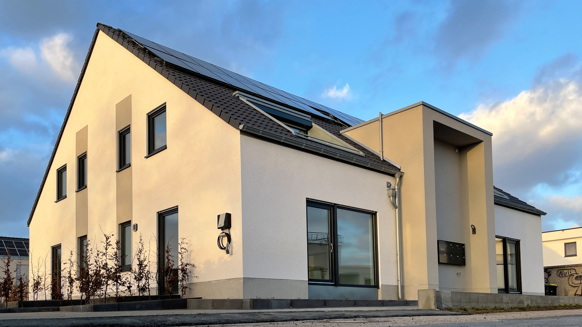 Eine moderne Luft-Wärme-Pumpe in Kombination mit der Photovoltaikanlage auf dem Dach ermöglichen die kompakte Bauweise ohne Kellergeschoss.